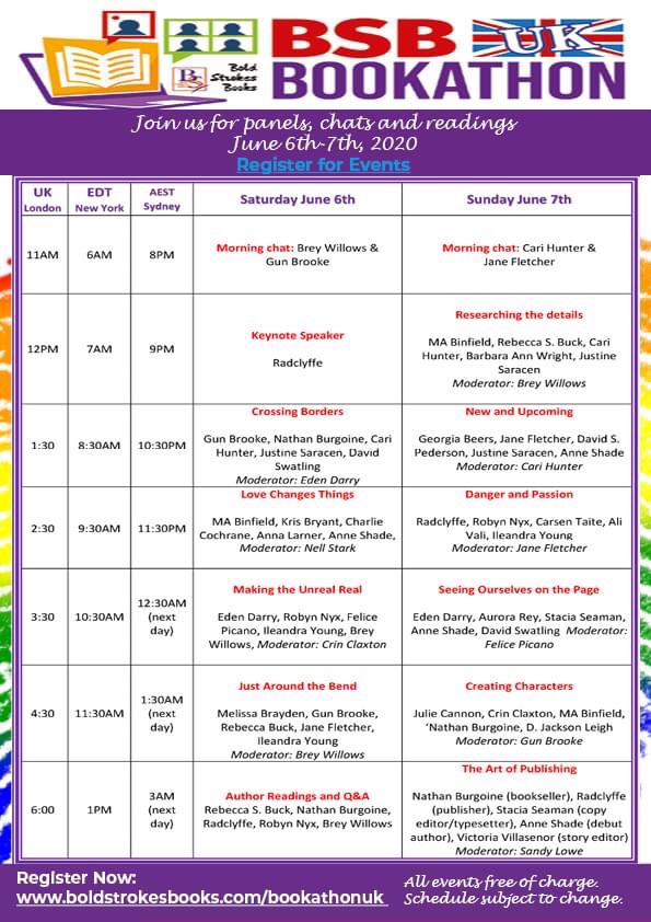 Here is the link to the program and to register (it’s free): https://bookathon.boldstrokesbooks.com/bookathon-uk-june-2020/